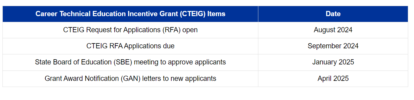 Program established as a state education, economic, and workforce development initiative to provide pupils in kindergarten through grade twelve with the knowledge and skills necessary to transition to employment and postsecondary education. Click Here for additional CTEIG Information.