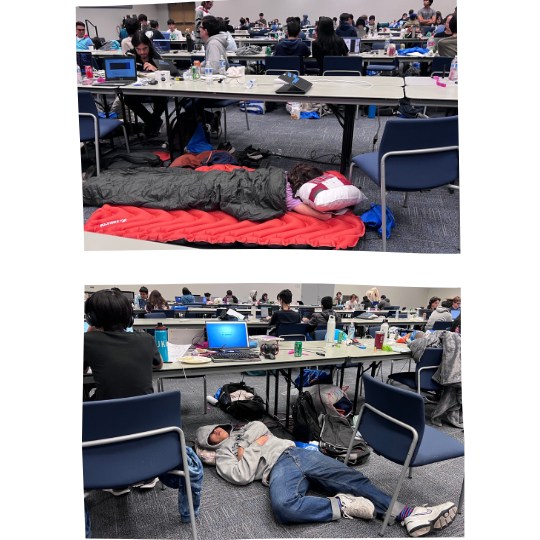 This event is only 24 hours long, so most students work hard all night long. You can catch some Z's in the main room (check out the pics below). This year we've got a "Nap Room" with a credentialed employee watching over it where you can go for some peace and quiet and either snooze or chill, no hacking allowed. Here are some of the crazy ways students crashed last year:
